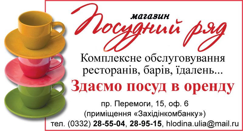 Обслуживание баров, ресторанов, гостинец, ЧП. ОПТ, мелкий опт. Посуда в ассортименте: стекло, фарфор, нержавейка, алюминий, стеклокерамика различных производителей и др. ПРОКАТ ПОСУДЫ!!! г. Луцк пр. Победы 15 оф.6 магазин ПОСУДНЫЙ РЯД,28–55–04,28–59–15.099–03–19–487 http://posudnyryad.hmarka.net |