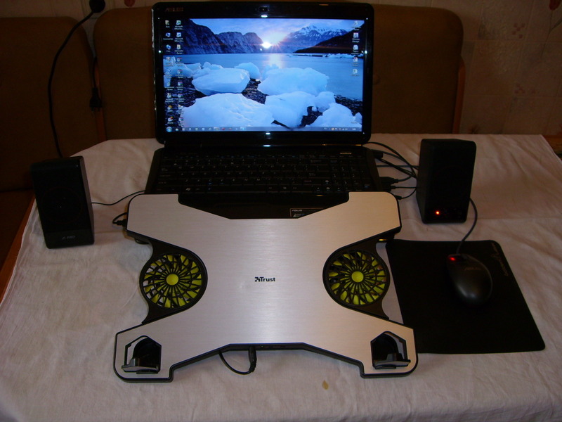 подставка с двумя вентиляторами, колонки, мышь, сумка, коврик.