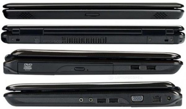 С правой стороны расположены 3,5 mm разъем для наушников и микрофона, а за ними еще два порта USB 2.0, выход VGA, порт LAN и разъем для подключения источника питания.