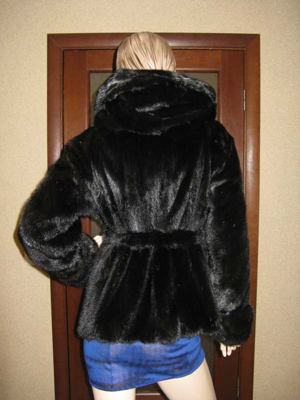 Норковый полушубок с капюшоном и поясом чёрная норка - Женская одежда