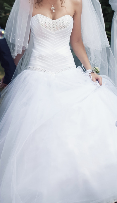 Белоснежное свадебное платье. Пышная юбка из фатина сделает любую фигуру более соблазнительной, создавая ощущение воздушности и легкости. Камни и жемчужины на лифе без бретелей выгодно подчеркивают зону декольте и плечи. А корсет, украшенный атласной драпировкой, скроет недостатки, делая линию талии более четкой. Фасон этого платья позволит Вам выглядеть идеально, скрывая все нюансы фигуры, о которых Вы могли бы беспокоиться. Вы почувствуете себя в нем настоящей принцессой, сошедшей со страниц сказки. P.S. в подарок – подъюбник из 7ми колец |