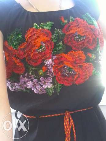 чорна вишита сукня чеським бісером. вишивка РУЧНОЇ РОБОТИ, сукня куплена, тканина легка, щось нагадує шифон тільки не прозора. є молнія з боку, довжина трохи вище колін-80 см. є поясок. розмір S |