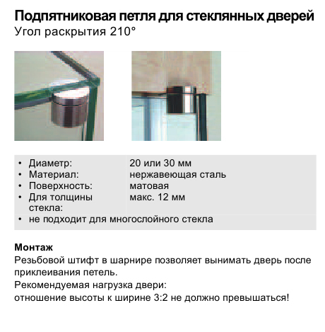 Предлагаем петли для стекла под ультрафиолетовую склейку - подпятниковая петля, петли для стеклянных дверей, для цельностеклянных витрин. Материал - нержавеющая сталь.