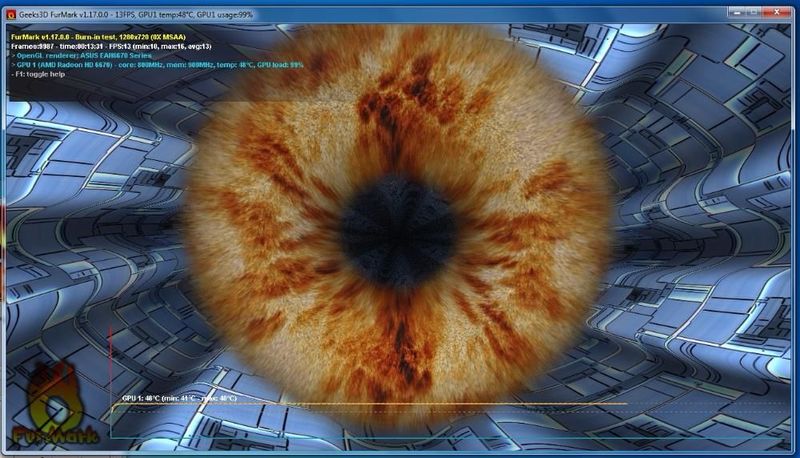 Відео - Asus EAH6670 , об'єм 1Gb, шина 128 bit, Direct 11, ( має пасивне охолодження на мідних трубках та я ще добавив кулер, температура вище 50 не виходить, дивіться фото FurMark пройдено 14 хв на максимумі і температура стабільна ) виходи DVI, VGA. HDMI ) WOT на середніх налаштуваннях 40-70фпс(залежно від карти) GTAIV на максимальних, більше ніяких ігор не встановлював через брак часу.
