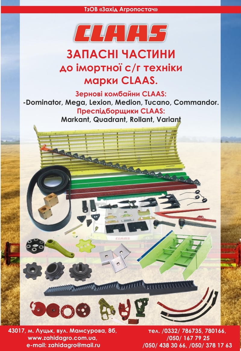 - запчасти к зерноуборочным и кормоуборочным комбайнам марок: Сlaas, Fortschritt, MDW, Holmer (решета, вариаторы, валы, клавиши соломотряса, редуктора, подбарабанья , элеваторы зерновые колосовые, решетные станы, сегменты, пальцы, ремни, флянцы, валы, вальцы, сальники, подшипники, цепи и др.).