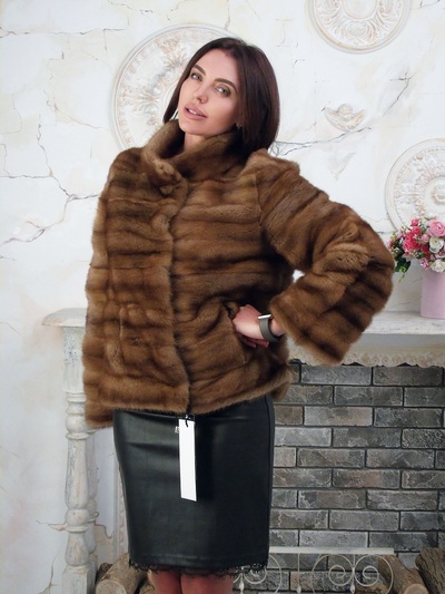 Стильная норковая шубка автоледи натурального песочного окраса с затемненными спинками, разновидность скандинавской норки scanglow. Изделие выполнено методом поперечного уклада пластин норки. Модель шубки прямая пиджачного кроя, понизу шубка присобирается на кулису. Воротник стойка. Рукава поперечные стандартной длины. Длина шубки 62 см. Шубка подходит на размер 44 46.